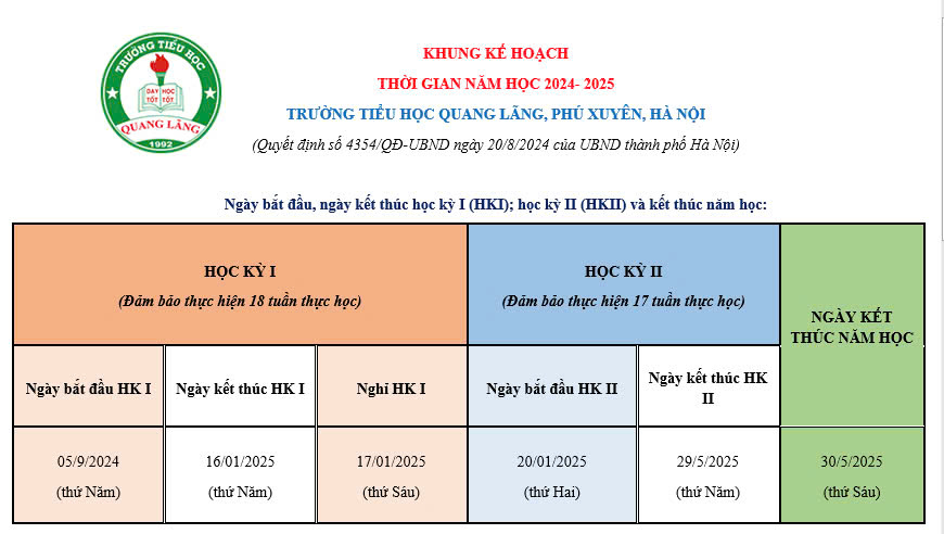 Nhà trường xin thông báo khung thời gian kế hoạch cho năm học 2024-2025 như sau: